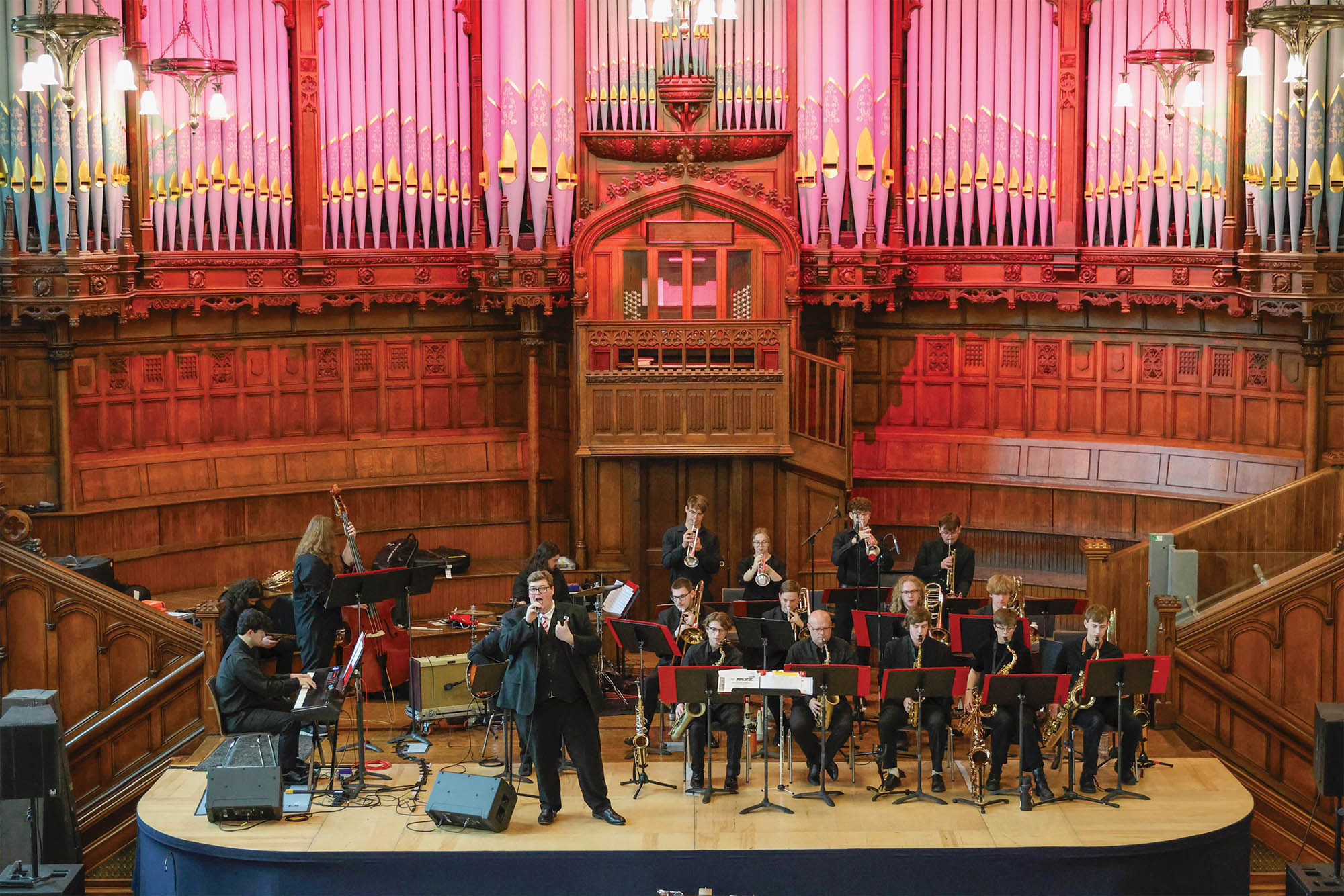 The Gustavus Jazz Ensemble and the Gustavus Symphony Orchestra toured Ireland, Northern Ireland, and Scotland this May. Here, in this photo, GJazz performs at the historic, Beaux-Arts-style Guildhall in Derry, Northern Ireland. In a dual performance, GSO also performed there.